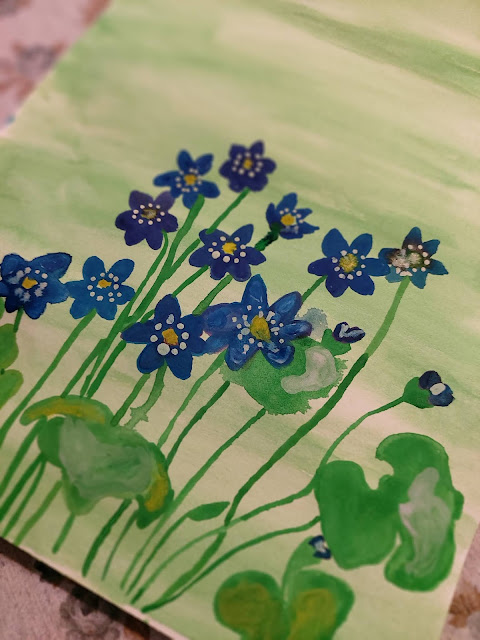 Bongasin Strömsön ohjelmasta akvarelli kukka maalausta. Ja sieltä se idea lähti päähän, pakko päästä kokeilemaan. Viikonlopun aikana sain maalattua kolme akvarelli kukka maalausta unikoista ja sinivuokoista. Tietenkin jokaisen oma tyyli on vapaa. Itse maalasin suoraan penssilillä, olisin kyllä voinut lyijykynällä jäljittää paremmin kukan mutoja. Vapaan käden maalaukset ja muistuttaa kyllä kukka lajeja mitä kuvastan.